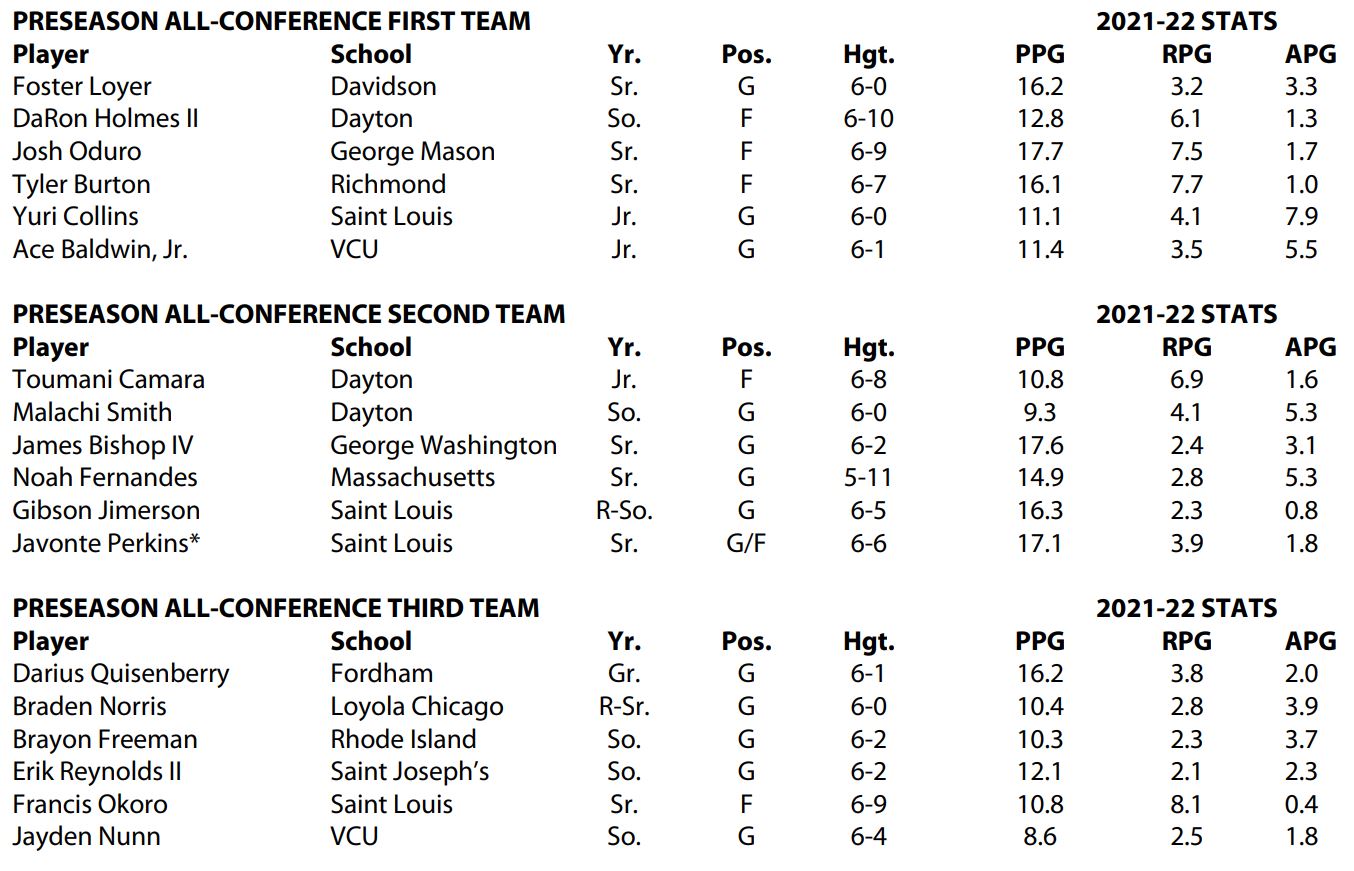 Ticket will make it over Quisenberry, Freeman and Nunn at the very least... 4 Saint Louis guys is hard to believe because that is a lot of mouths to feed... I personally think Okoro has a better year than JimersonYeah. At 10.2 Pts, & 8.1 Rebounds (not to mention his 3P%, Blocks and Steals) I think there's a strong case for him to have made the third team at least. They put Okoro on third team (10.8 & 8.1) but otherwise feels like scoring average was the biggest factor along with team performance (Dayton & SLU w/ 8-of-18 picks)